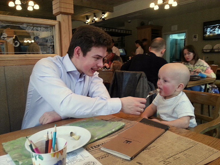 Мы регулярно с возраста в месяц ходим все вместе по таким местам. Дима знает, как себя там вести. Хотя иногда скучает, тогда мы идем изучать кафе, раскидываем вместе салфетки, бесимся в детской комнате.