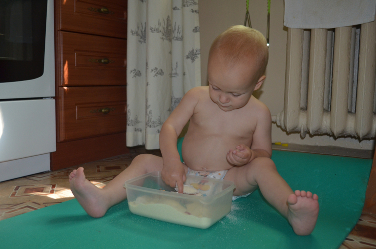 Замечательный мальчик. Сенсорные игры с манкой это круто)) представляю сколько потом уборки)