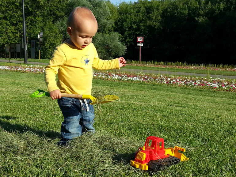 В парке много интересного, много деталей и событий вокруг, много деревьев, травинок и цветов, есть пруд. В общем, полно всего того, о чем можно поговорить и рассмотреть, потрогать и сорвать, понюхать и чем пошуршать, собрать в кузов машины и перегрузить в другую.