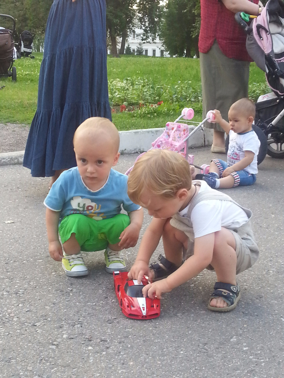Вот, на фотографии видно, что с машиной (не нашей) ему поиграть хочется, но забрать её (не у хозяина) он не решается.