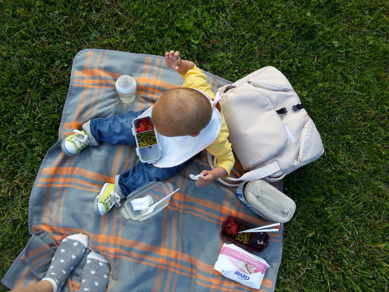На улице Дима ест или сидя в коляске, или сидя на пледе на газоне, или на скамейке в парке. Приятно, что теперь я могу доверить крошке есть самостоятельно и на улице - он достаточно аккуратен при условии правильного выбора продуктов мной.