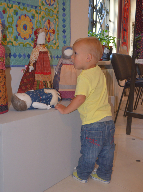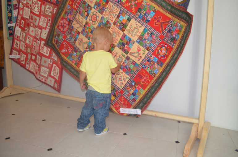 После занятия мы ещё минут десять трогали и рассматривали экспонаты выставки лоскутного шитья. Особенно Диму поразил коврик с выпуклыми элементами. Он и так к нему подойдёт , и эдак, и потрогает , и покрутит. Заинтересовался, в общем.