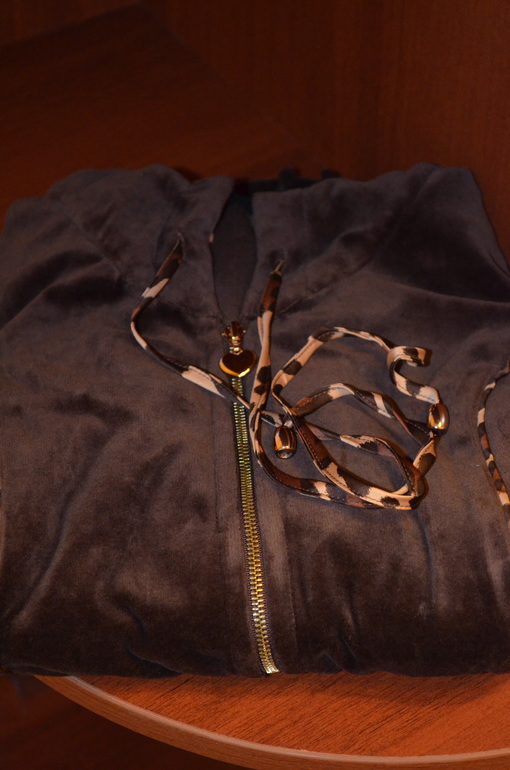 И жакет с капюшоном из велюра, цвета насыщенный шоколад, стоимостью 590 рублей, размер S.