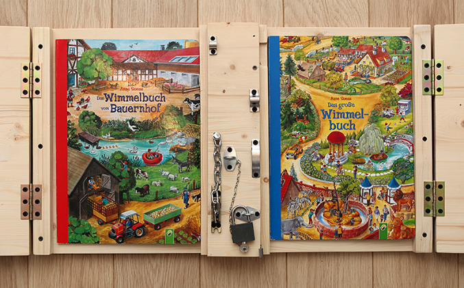 Ах, да! Когда все замочки открыты, дверцы можно распахнуть. И там по задумке должно быть что-то такое, ради чего захочется научиться эти замочки все открыть. Пока там ничего нет, я просто положила книжки.