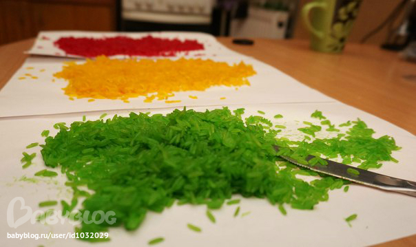 Ну вот с кем можно поделиться подобным удовольствием - красила рис в 12 ночи. Сын наутро заценил сразу же. Минут 40 пересыпал и ложкой, и через воронку. Сначала слоями 5 банок засыпали, потом просто