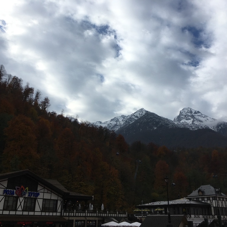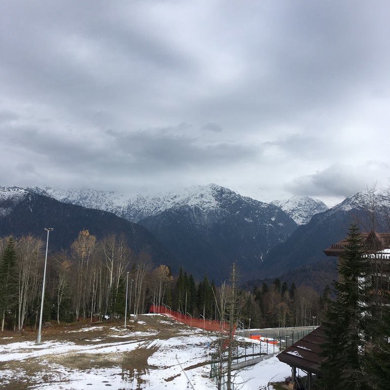 На Розу Хутор нам было не надо- работал только один подъёмник. Поэтому мы прогулялись вдоль реки до остановки, сели на рейсовый автобус и через одну остановку уже были на курорте Газпрома.