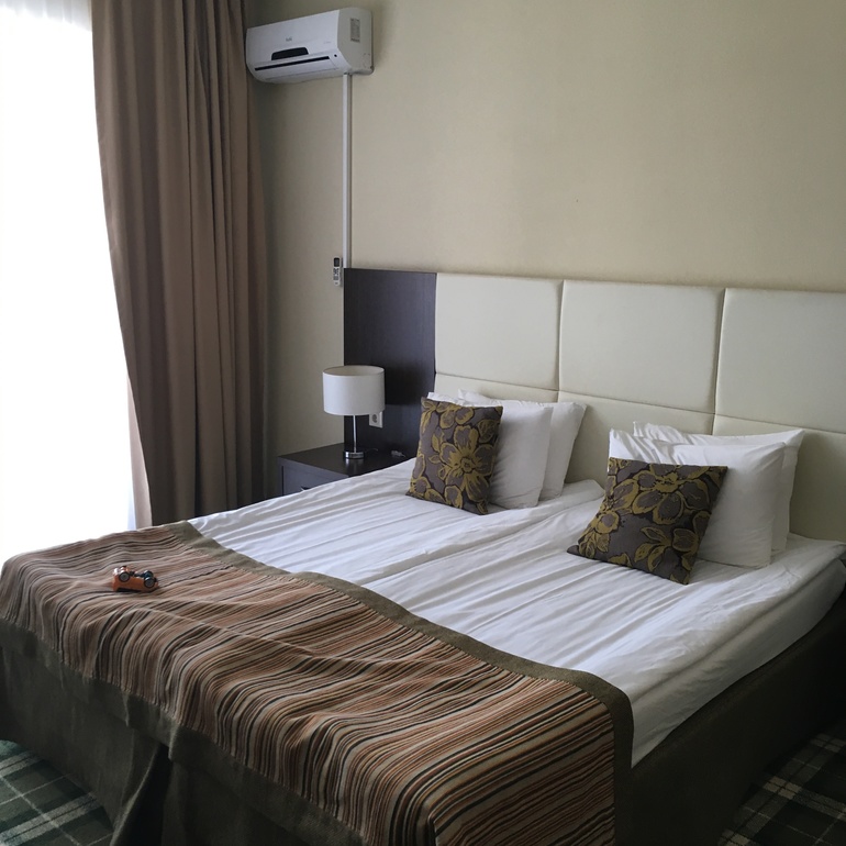 Мы жили в главном корпусе, мои родители в корпусе Рим. Вот номер у них скромнее. И не только в размерах дело. Все более поюзанное -ковралин, например)) Вместо биде у них был гигиенический душ, а вместо ванны душевая кабина