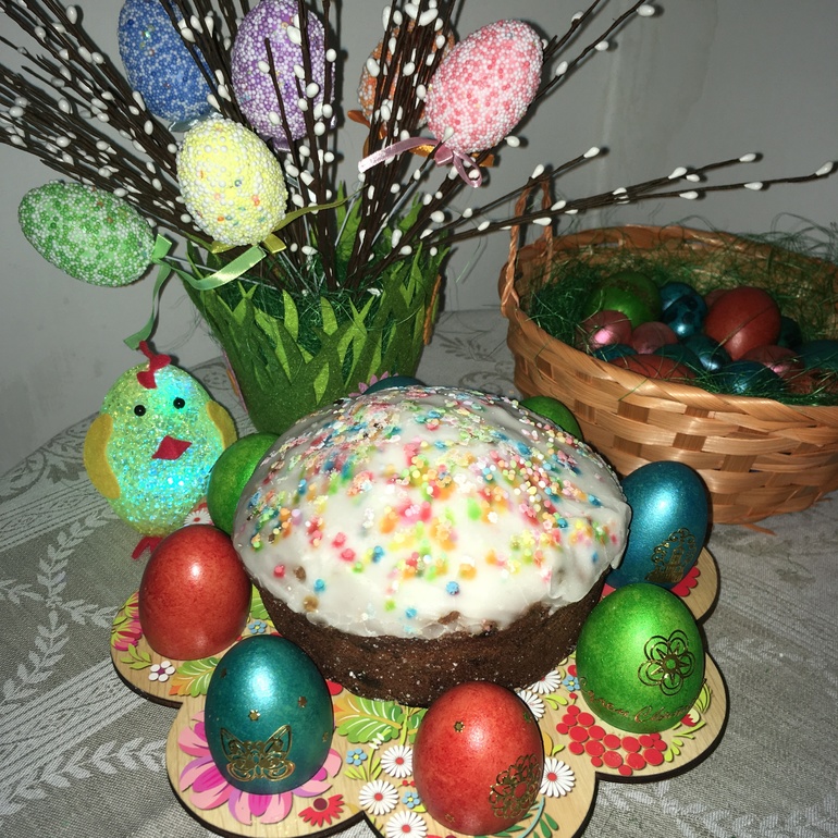 Не ожидала, что нас и крашенными яйцами, и куличом угостят. Все везла с собой. Вот такая композиция у меня получилась.