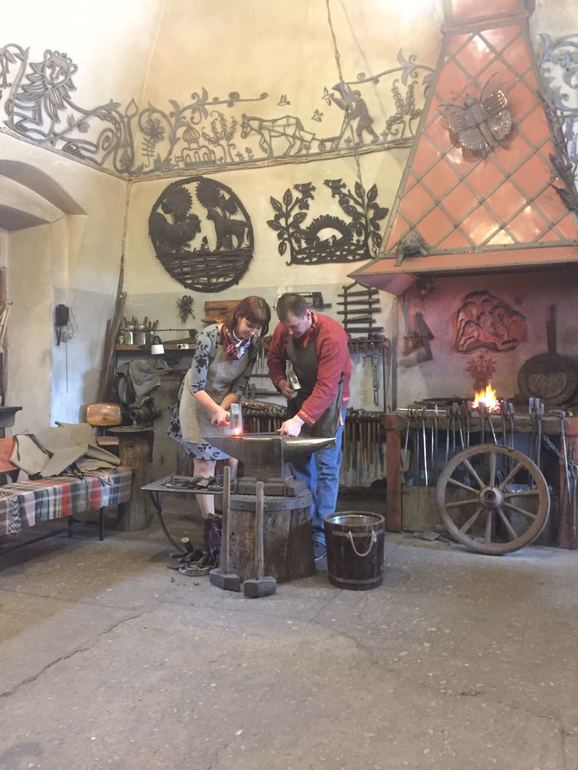 В кузнице ну ооочень понравилось! Были в подобном месте в Сочи. Здесь круче однозначно!!! Очень красиво оформленно помещение, сам кузнец как будто создан рассказывать и показывать о своём ремесле-экскурсия небольшая и интересная, ну мастер-класс- делали гвоздь)