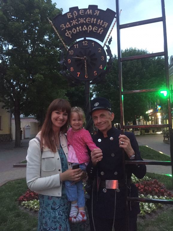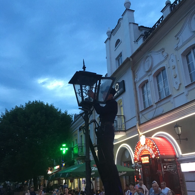 Ежедневно на пешеходную улицу Бреста выходит фонарщик в старинномй униформе. Он несёт с собой лесенку. Приставляет ее к каждому столбу, забирается на неё и зажигает фонарь🤗