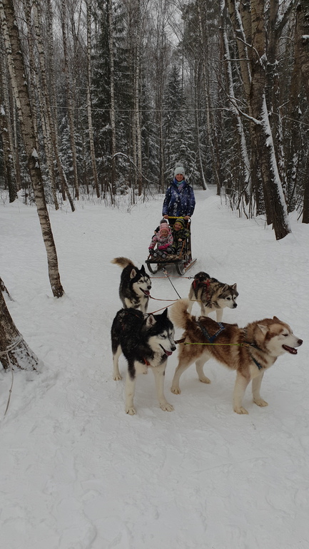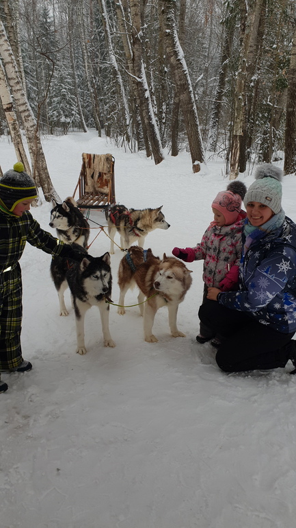 Но и в питомник не пошли) Посчитали, что рациональные прокатиться на упряжке. И погладить этих милах в лесу, а не в темном вольере)