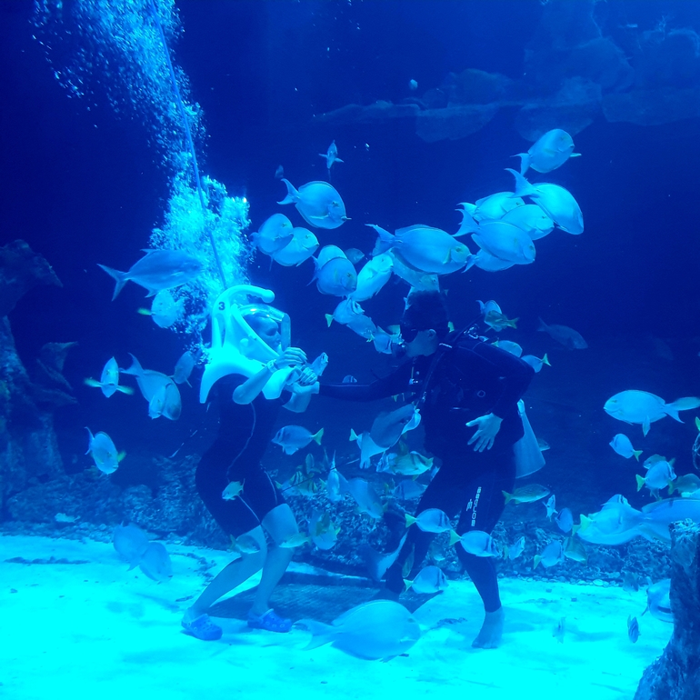 Здесь есть возможность опуститься в огромный аквариум с красивыми рыбами. Погружение в специальной маске. Думается, прикольно. Стоит это 60 $.