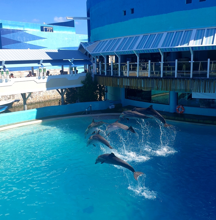 Попали на интересную процедуру- осмотр дельфинов ветеринаром с последующим кормлением. И небольшое представление.