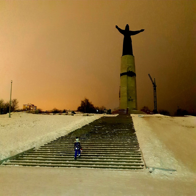 И вот мы в столице Чувашии (от Йошки меньше 100 км). Первым делом хотели посмотреть Мать Покровительницу. Огромный монумент! Эффектный. Жаль, временно не подсвечивается.