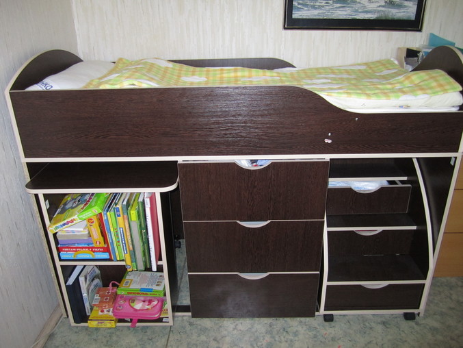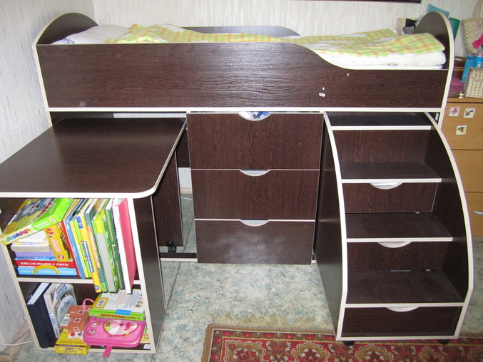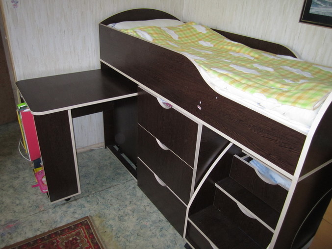 Продаем кровать в связи с переездом. Матрас в подарок, беспружинный ортопедический , очень удобный. Пользовались всего полгода. ВСЕ в хорошем состоянии. Кровать Орбита 14 универсальна.При сборке Вы сами решаете на какую сторону собрать стол. В комплект входит:верхняя кровать, выкатной стол, комод и лестницу с выдвижными ящиками.