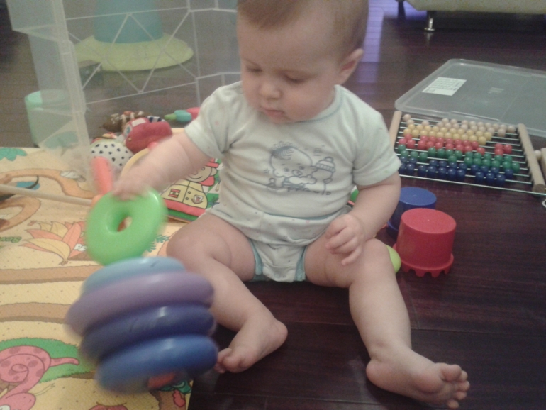 Вчера я, наконец-то ,дождалась нового этапа развития Горошка!Мой сын все-таки понял зачем нужна пирамидка!До этого нас привлекала только чудесная красная палка от нее,которую можно грызть,куда-нибудь прятать,и много еще всего!А вчера мы сидели играли и он как-то сам понял,что на нее можно одевать" бублики"!Я в таком восторге не была,когда он на ножки первый раз стал!!!В моих глазах он просто лауреат нобелевской премии!!!))))