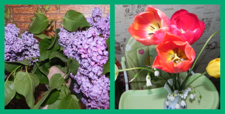 Мы все 4 дня выходных провели у мамы с детками,так как наш папа работает не покладая рук)))У них нет выходных,печально конечно)))Но когда приехали - он нас порадовал, в комнате прибрал и цветочки даже поставил в вазу,а мы тоже с цветами приехали, теперь у нас дома цветочное настроение)))