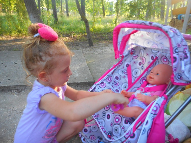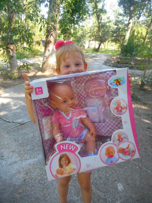 Софа давно уже просила купить ей коляску и пупса,но мы из тех родителей которые по первому требованию ничего не покупают(может по этому она потом долго не теряет интерес к ним)...и тут крестный и дедушка нас удивляют всех!!!Они дарят пупса и коляску....Счастью не было предела!!!Счастливые глаза ребенка сказали всё!