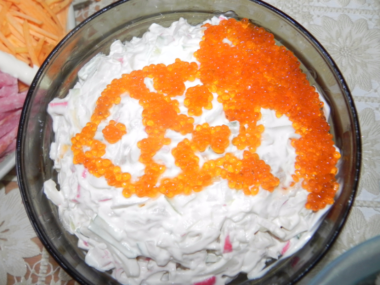 А это любимый салат Софы, кальмары,краб.палочки, огурец,сёмга и икра,вкуснятина)))