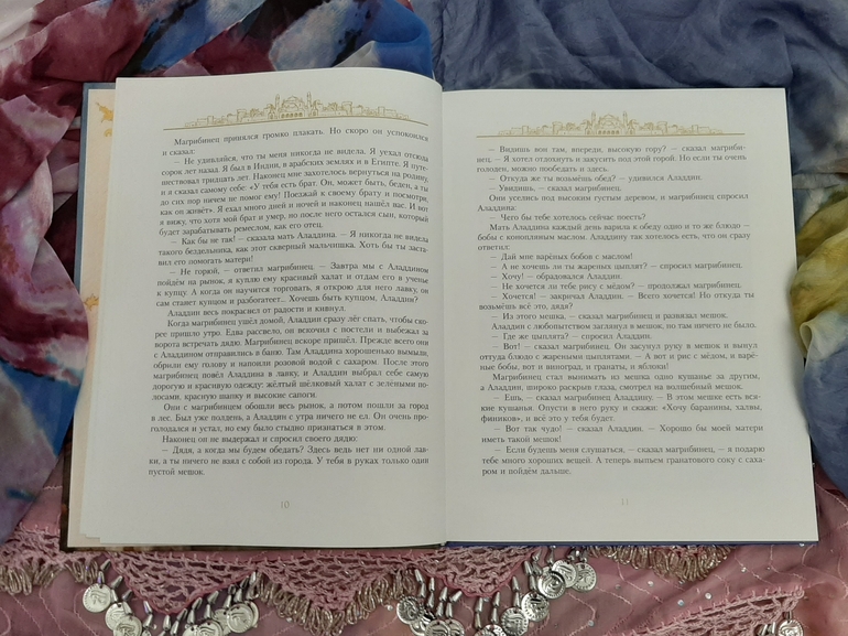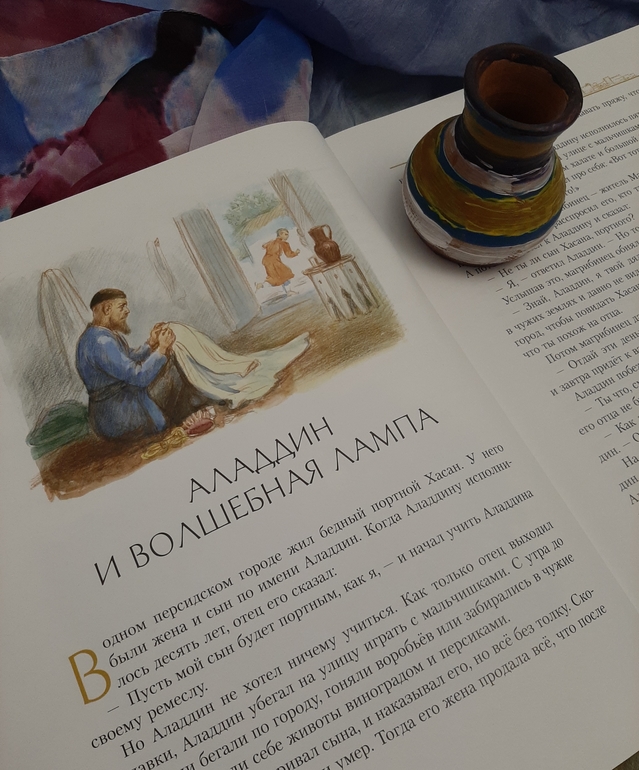 Так что читать я не спешила, но тут дочка посмотрела новый фильм про Аладдина, очень мне советовала, и мы с Денисом тоже решили попробовать. Ребенку кино очень понравилось, я и решилась почитать. И хотя оригинальный сюжет сильно отличается от кино, в книге класический перевод М. Салье, ребенок прослушал все сказку, и уже несколько раз перечитывали. Но я, конечно, читаю в сокращении.