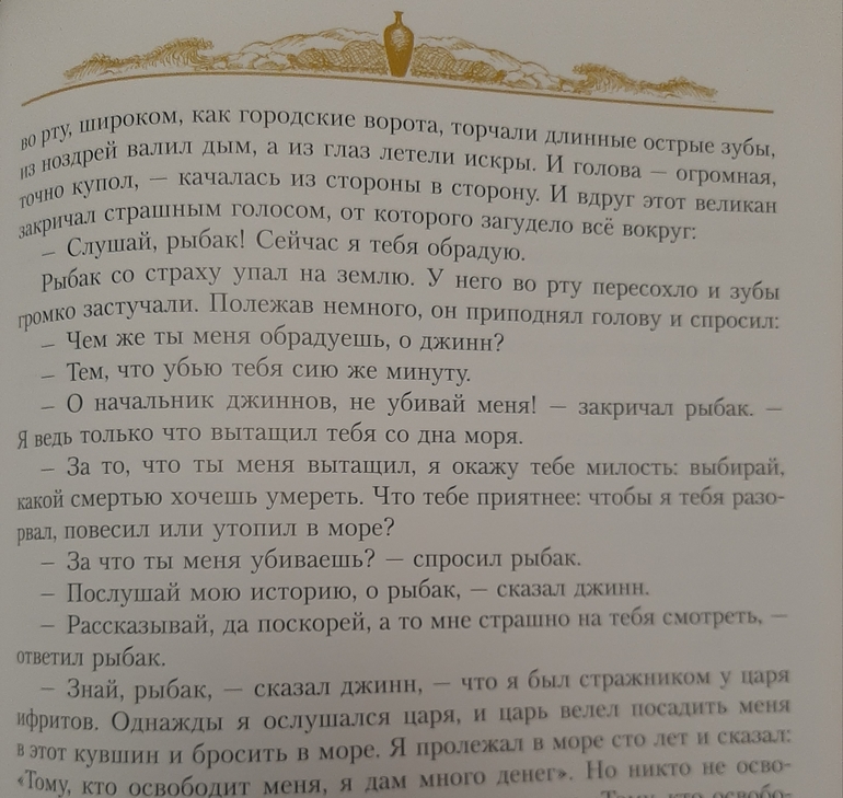 Ребенок мой теперь мечтает о лампе, не зная еще, что джинны не всегда добрые. Вот в сказке О рыбаке джинн чуть жизни не лишил того, кто его спас