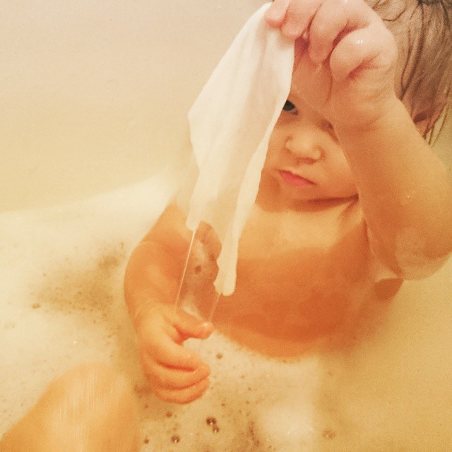 Как же просто радовать детей в этом возрасте. Им интересно все и порой самые простые вещи приводят их в восторг больше чем навороченные игрушки. Любимая игрушка в ванной это небольшая тряпочка. А еще сегодня мы ловили мыльные пузыри совочками.