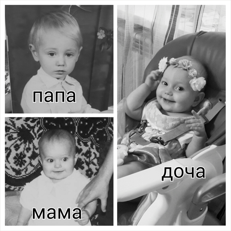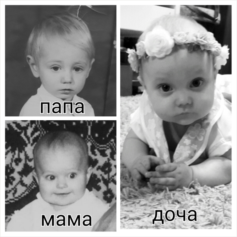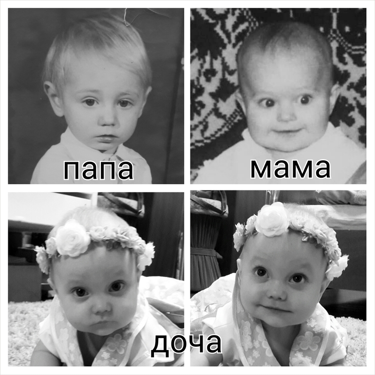 Ну и на по следок, делала как то коллаж "на кого все-таки похожа Даша", на мой взгляд, когда Дашуля улыбается, то больше в ней моих черт, когда сама-серьезность, то папиных. Папе на фото 2 года, с меньшим возрастом фотографий нет, мне ближе к году.