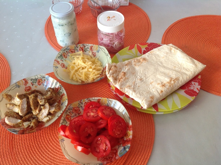 И на ужин сделала домашнюю шаурму. Помидорчики, курица вчерашняя остатки, лук маринованный (яблочный уксус, соль, сахар, вода), сыр и соус самодельный (домашний йогурт, огурчики свежие, соль, перец, петрушка) и лаваш