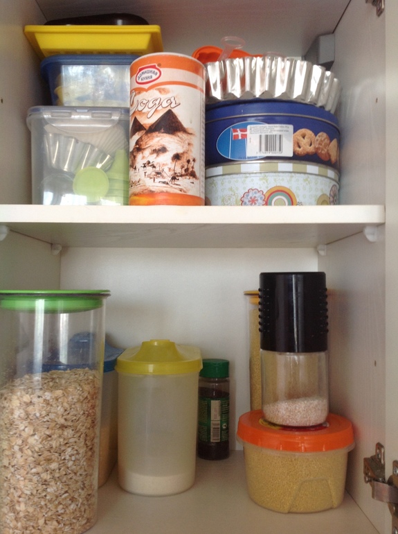 Задание Келли. В холодильнике порядок, в морозилке тоже. Немного перетряхнула ящики с крупами. Читаю сейчас книгу Избавь свою жизнь от хлама, понравился принцип Подобное к подобному и разделить кухню на зоны. Поэтому собрала в одном месте все для выпечки: формочки силиконовые и металлические, шприц кондитерский, большие формы для кекса и вафель, там стоит ещё сода. Там стоят ещё две жестяные коробки, печенье домашнее туда складываем. На нижней полке стоит все для каш.