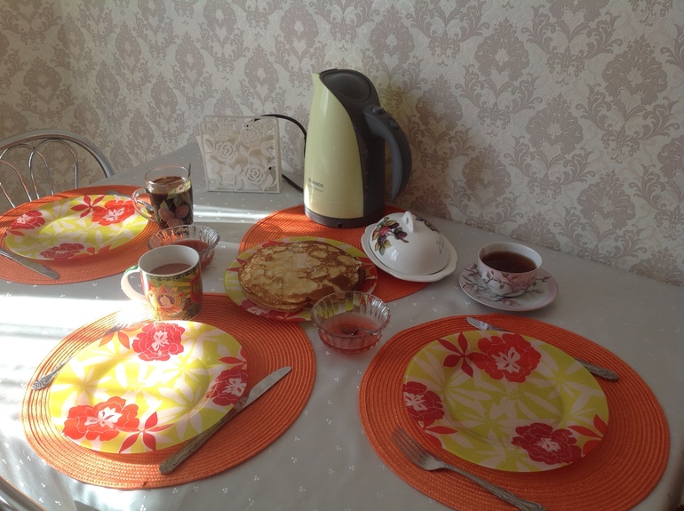 Завтрак для семьи - блинчики из кислого молока, на этот раз получились толстые (рецепт новый), обычно пеку тонкие ажурные, домашнее варенье и конфитюр из слив. Мужу кофе, мне чай, сыну какао. Дочь на пробежке, она позже позавтракает.