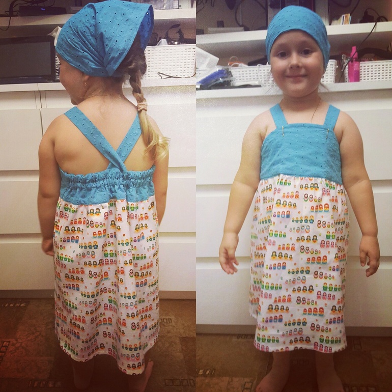 Первый раз шью сарафан)) да и вообще с одеждой до этого не связывалась, один раз шорты шила. Но когда дома нашёлся шикарный кусочек ткани с матрешками, я не удержалась. Надеюсь и на следующий год пойдёт. Хотелось юбку пошире, но ткани было впритык))