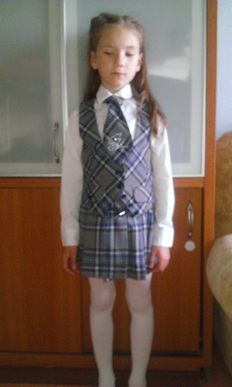 Клетка шерсть и вискоза. Темно-синий хлопок. Все вещи сочетаются друг с другом. Получается рубашка х\б liu Jo, блуза трикотаж моне 2 шт., жилетка моне 2 шт., юбки моне 2 шт., галстук моне. Есть еще пальто на утеплителе тоже 116 марк спенсер.