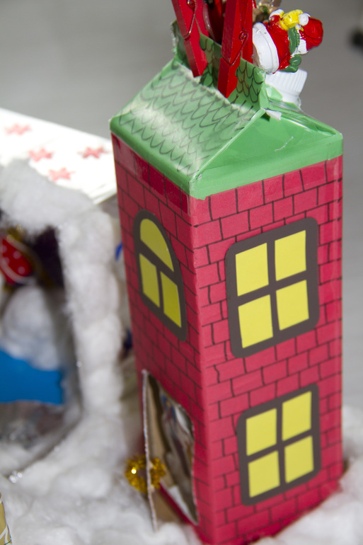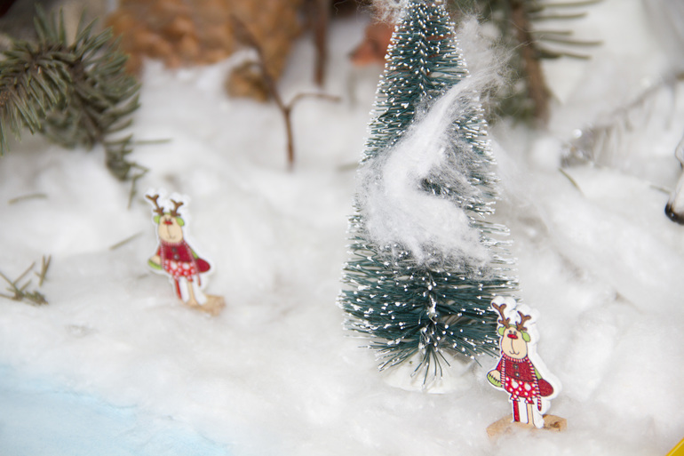 Весь наш городок расположился на большом листе картона, я специально не стала размещать его на полу или подоконнике, чтобы его можно было перемещать и передвигать. Снег я сделала из обыкновенной ваты. Часть приклеила на клей, например, в лесу и на деревьях, в остальной части разбросала его произвольно, поэтому иногда в процессе игры он исчезает из одной части города и образуются сугробы в другой его части.