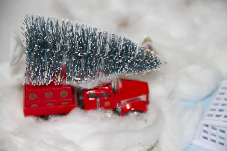 А вот машина везет кому-то новогоднюю елку, правда немного застряла в снегу)