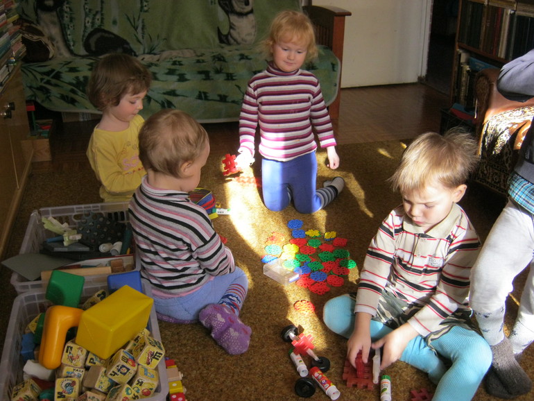 Помыла после завтрака посуду, захожу в комнату - дети играют. Да так вдохновенно, дружно, никто никому не мешает, не ссорятся. Девочки "печеньками" друг друга угощают, Родион их и себя "напитками" из бутылочек, Максим самолет строит "с фарами"