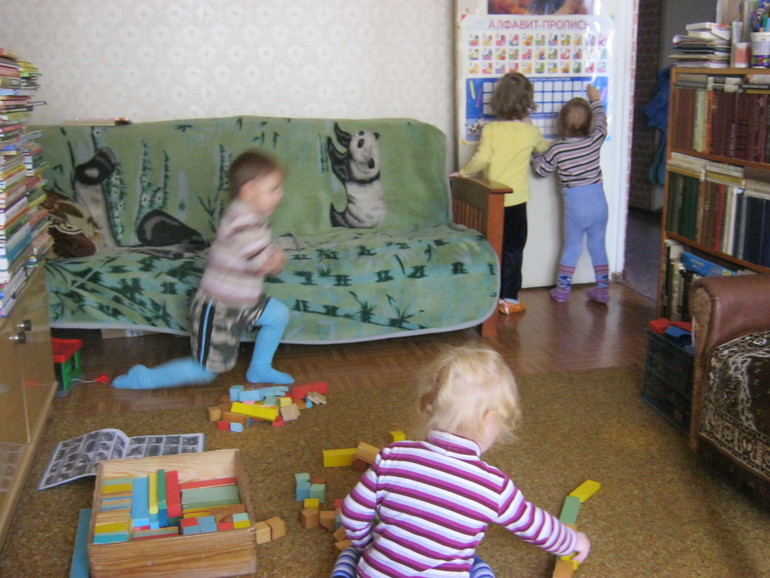А Марина увлеклась построением малой китайской стены и выгребанием кубиков из ящика. Соня с Микой распевали алфавит, Соня инструктировала, поучала, поправляла...