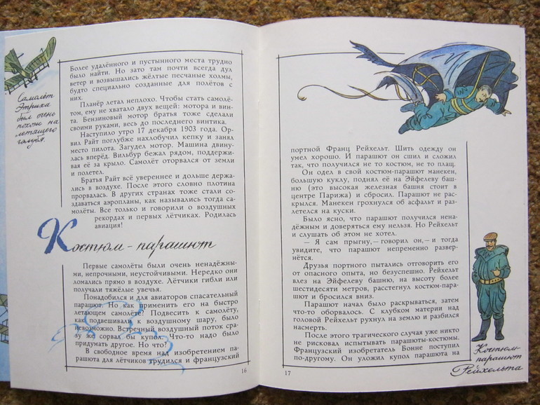 историю создания первого ранцевого парашюта, названо много имен. Я очень признательна ему за рассказ о страхующем приборе, о братьях Дорониных., Котельникове, Минове. Жаль только, что имя Льва Мациевича - одного из первых русских авиаторов не назвал. А именно его гибель во время показательных полетов так потрясла театрального актера Глеба Котельникова, что он решил во чтобы то ни стало изобрести для летчиков надежное средство спасения. И изобрел. Автор подробно описывает какие изменения и усовершенствования в конструкции парашютной системы были сделаны Котельниковым.