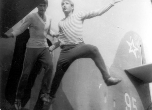Это отработка приземления - ноги вместе (и ступни и колени), а затем - перекат. Этими перекатами нас буквально замордовали, и строчки песни Городницкого "Все перекаты, да перекаты, послать бы их по адресу" пелись с особым вдохновением почти сладострастием.