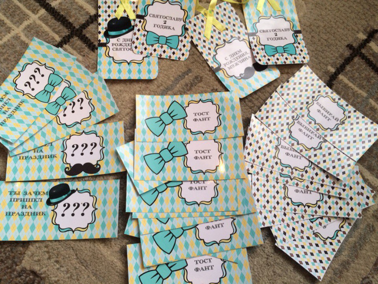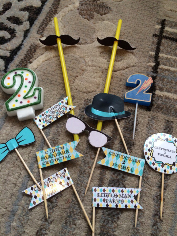 3. И еще одно выгодное предложение. Продаю с большущей скидкой набор для оформления дня рождения в стиле Little Man для Святослава. Мамы Святославов двухлеток - это предложение для Вас. Коробочки для закусок (2штуки), карточки для пожеланий (2штуки), таблички для напитков (4штуки), игры (тост фант, зачем пришел на праздник, фанты), растяжка 2 годика, трубочки (2штуки), цифры в торт, топперы (9штук), колпачки (5штук), шоколадки 20гр в этикетках (9штук). Создание дополнительной атрибутики по договоренности. За всю красоту хочу 800р, стоимость по прайсу 2220р. Фотографии в реальном времени (на ковре) и фото с праздника: