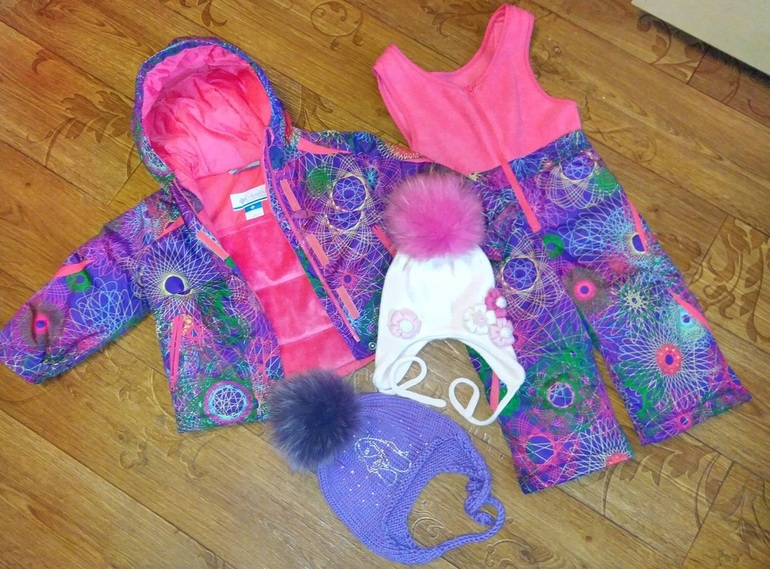 7. Columbia комплект зима на 1,5-2 года (марк. 2Т) + две шапочки. Комплект в идеальном состоянии, легкий не толстый и при этом очень теплый, удобный, мембрана, не промокаемый не продуваемый, "меховая" вставка внутри, в п/к лямки регулируются большими липучками, маркировка 2Т. шапочки б/у молочная с розовым помпоном двуслойная меринос Solorana (Италия), фиолетовая однослойная из итал.п/ш (самовяз). Ребенок будет ярким и нарядным, в тепле и с комфортом) Все вместе 3500. Сейчас на заказ у оргов такие комплекты от 7500 (только коламбия).