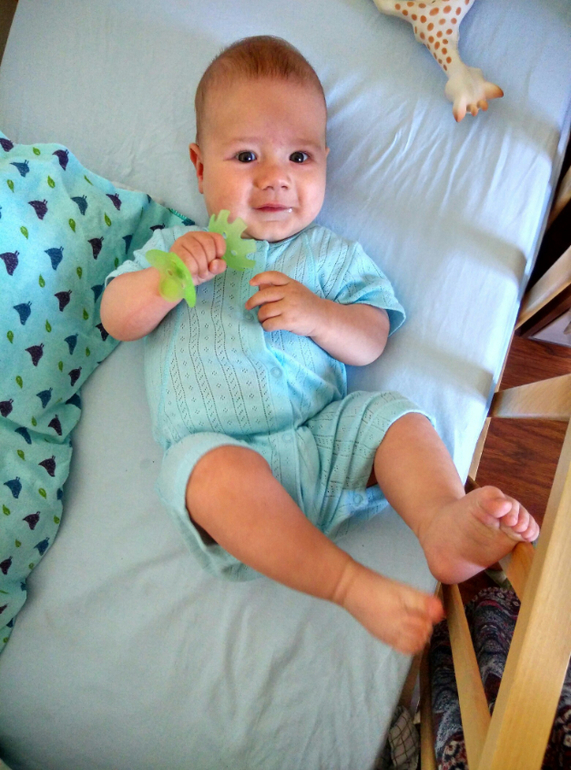 --- Переворачивается бодро на живот, а обратно всё ещё никак. Хотя последние пару дней предпринимает попытки, но мешает сам себе, упираясь локтем.