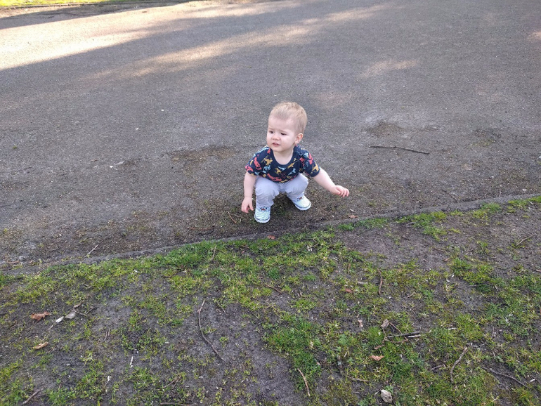 Здесь, в Нидерландах, теплее, чем в Питере, уже всё растёт, цветёт и пахнет, поэтому знакомлю Тима с травкой, листиками и прочей зеленью. В парках часто встречаются люди с собаками, Тиме последние явно интересны. Повторяет "аф-аф" за мной, но пока не уверена, что соотносит эти звуки с конкретными животными.