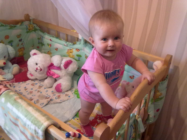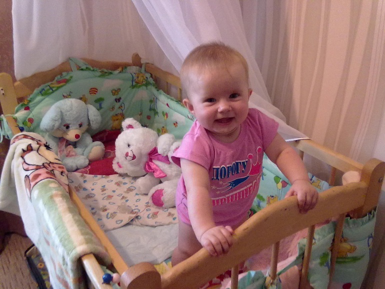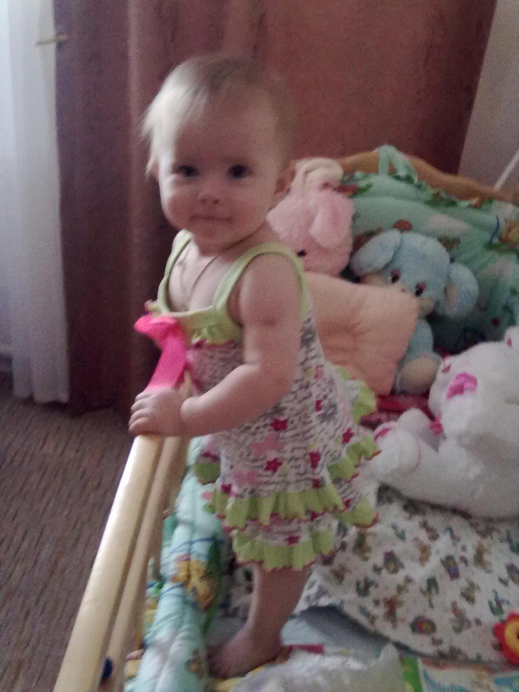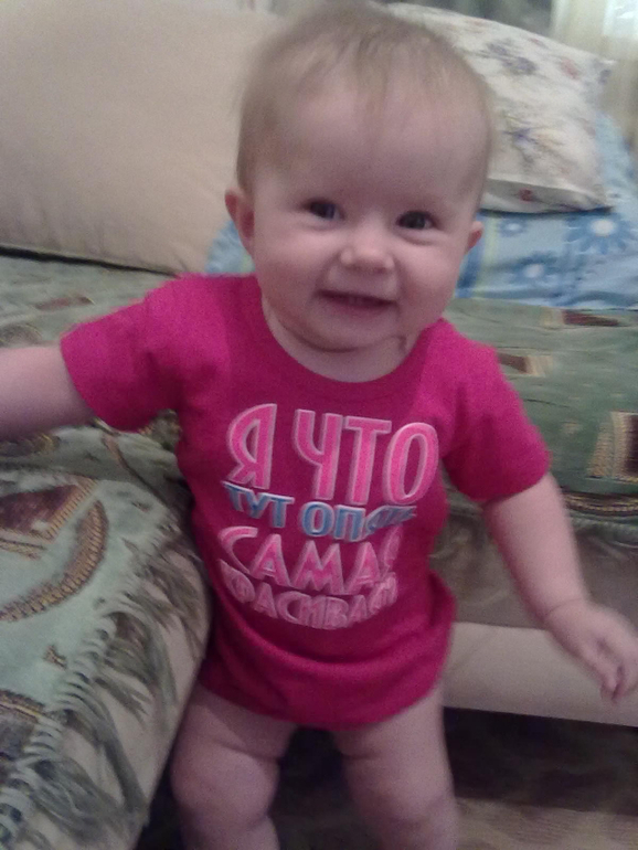 Подводим итоги 7 месяцев: Рост 75 см вес 9800. имеем 2 нижних зуба- верхних ещё нет... но надеюсь скоро будут, кушает супы и борщи на мясных пюре, от фруктового отказывается, соки немного совсем, каши всякие молочные и безмолочные, но вот на хайнз был запор- клизмачку ставила..Пьет водички немного и то скорее всего потому что очень жарко!!! Грудь не бросает постоянно её требует.. ночью полностью на груди. Сосём соску. Лентяйка, ползать не хочет, ходить по краю дивана не хочет- вот держи её и веди только- тогда аж в припрыжку бежит!!!Смеется.!!! Ползать не хочет хоть убей( то задницу оттопырит и гребет ногами, то на руки упор и всё.... ) много раз показывала как ползать- всё к 0.. походу будет как братишка- тот тоже не ползал а сразу пошел.Машет на прощанье рукой- всё понимает!!! и ладушки играет! Любит купаться, но умываться не любит- отворачивается