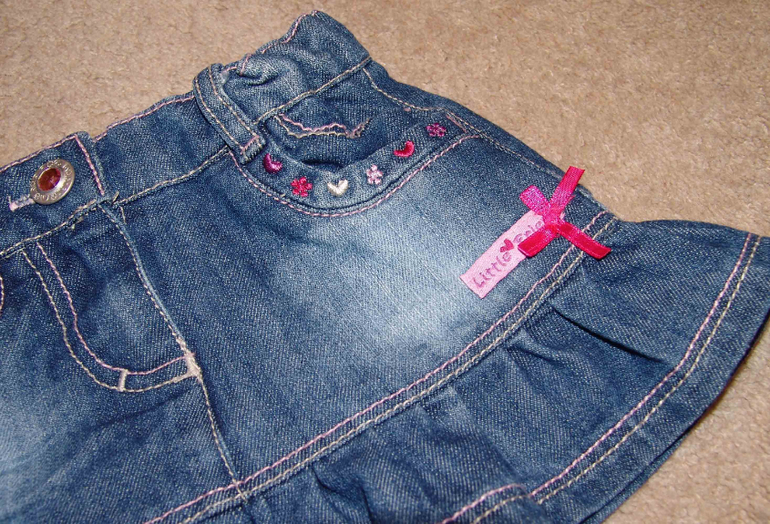 14. Джинсовая юбка. Размер 74 (мне кажется немного большемерит). Застегивается на пуговку, молния, в поясе утягивающая резинка. Состояние новой (одевали раза два)