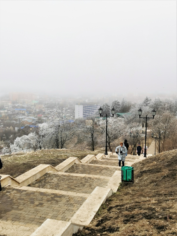 В первый день пошли на гору Машук. До канатки дошли пешком, часть пути шли в гору. С коляской не очень удобно ходить, асфальт в городе не очень, пандусы не везде есть, перепады высоты опять же.
