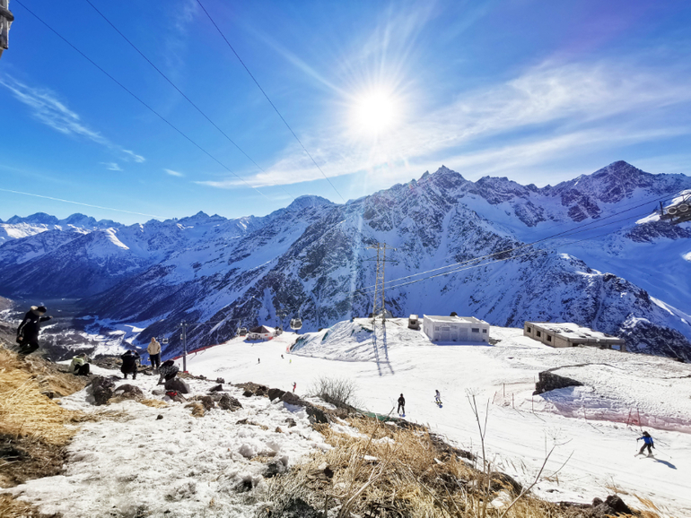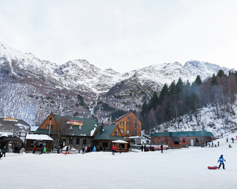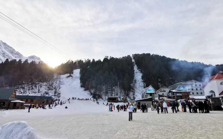 Дальше поехали на Чегет, там канатка кресельная. Туда тоже не стали подниматься, погуляли внизу.