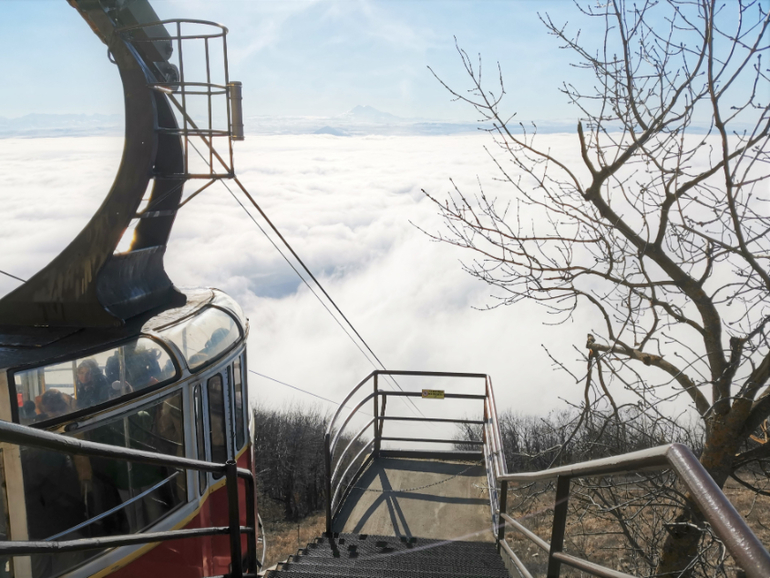 Поднялись на канатке и попали в какое-то очень дивное место. Лестница, ведущая в облака. Эти облака просто бесподобно смотрятся, кажется, что они совсем рядом. Прямо так и хочется в них нырнуть.