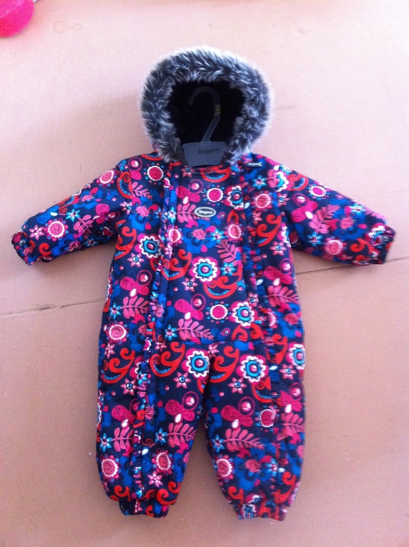 В идеале, ездили в нем в коляске, не ползали, не катались с горок, никаких потертостей и прочих косяков. Пристегиваются варежки и пинетки. Размер 80, но и на 74 отлично сидит