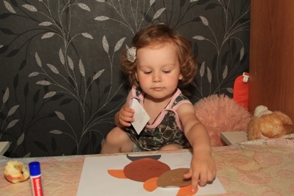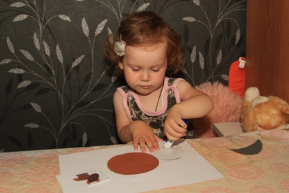Далее сделали аппликацию, Алена мазала клеем и приклеивала, а я показывала куда именно необходимо приклеить ту или иную часть тела.