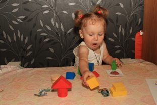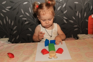Далее начали вспоминать как выглядят яблоки, и выбрали все круглые элементы, затем все красные. А потом Алена раскладывала по цветам фигурки животным: зайцу строили красный домик, а ежику желтый.